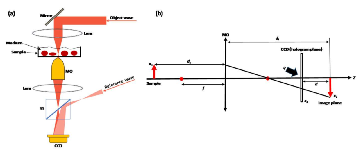 Hologram은 object wave O와 reference wave R을 interference 한다. 두 개의 waves는 laser propagation방향으로 beam splitter를 넣음으로서 얻어진다. 이것은 Mach-Zender 간섭계(Figure 1(a)를 보자)와 유사하다. Object beam은 표본을 비추고, 현미경 대물렌드(MO)는 object wavefront를 수집하고 확대한다. CCD 카메라에 의해서 spatial interference가 기록되고 numerical reconstruction을 위해 개인 컴퓨터로 정보가 전송된다. Object wave O와 reference wave R의 작은 경사각은 real image를 twin images와 zero-order noise로부터 격리시킨다(off-axis geometry 때문에 가능). Real image의 대역폭만을 커버할 수 있도록 적절하게 정의 된 spatial filter가 real image를 유지할 수 있다. 신호를 reconstruction하기 위해 filtered된 hologram은 reference wave와 곱해진다. 그리고 Fresnel approximation에 의해 reconstructed된다. 이렇게해서 신호를 aplitude image와 phase image로 변환가능하다(Figure 2를 보자).