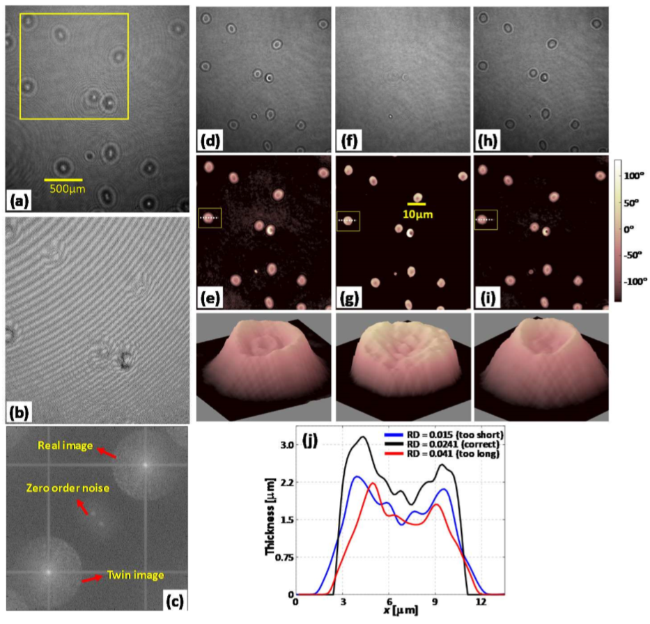 이 논문에서 phase value는 때때로 reference wave와 sample을 통과하는 wave 사이의 optical path length difference(OPD)로 표현된다. 그리고 앞에서 알아본바와 같이 digital holographic reconstruction에서 in-focus reconstructioned image는 hologram기록중인 CCD와 image plane사이의 거리가 reconstruction distance와 같을 때 얻어진다. Figure 2. 에서 reconstruction distance가 정확하지 않아 out-of-focus image가 발생한 것을 볼 수 있다.