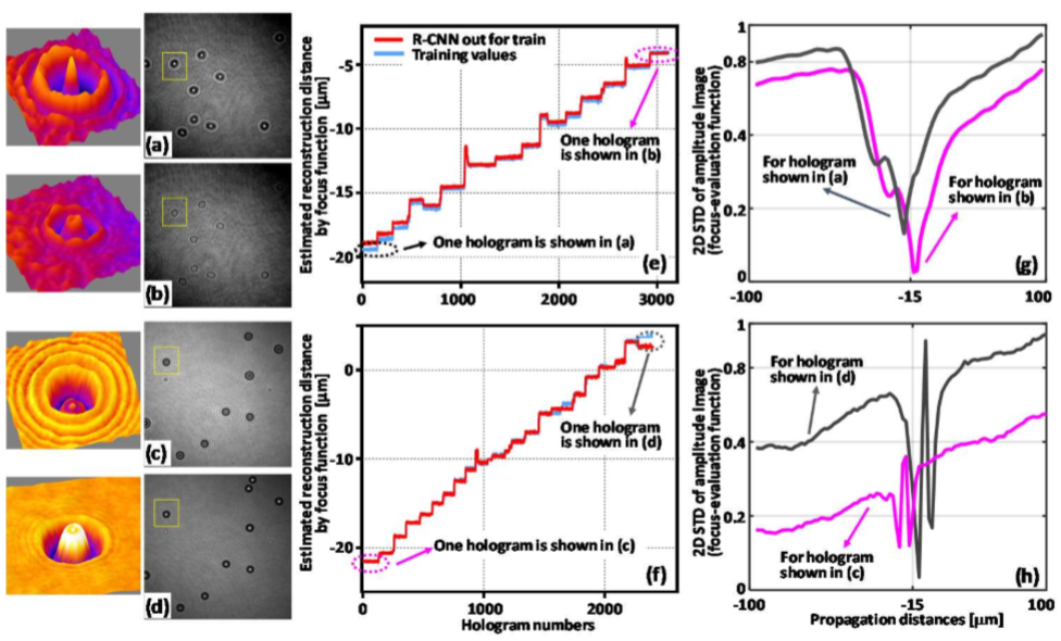 Training set을 만들기 위해 sample과 MO의 distance를 조절한다. 앞에서 말한것과 마찬가지로 holograms는 R-CNN model에 들어가기전에 filtered된다. Filtering은 noise와 hologram에 저장된 비정보 공간 패턴을 제거한다. 이렇게하면 완벽한 패턴을 R-CNN에 제공할 수 있다. Training data를 위한 focus image는 amplitude image의 STD를 사용하는 focus-evaluation function에 의해 얻어진다.