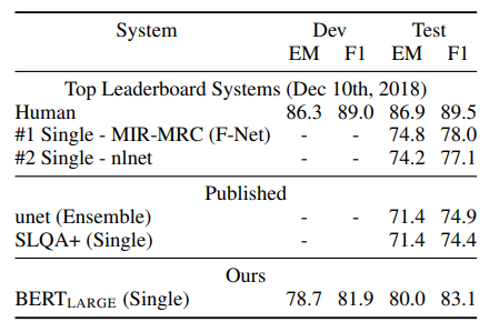 - SQuAD 1.1에서 짧은 답을 제거하고, 문제를 좀 더 현실적으로 가공한 데이터셋입니다.