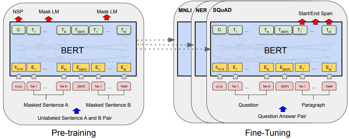 이렇게 도입한 MLM과 NSP로 Pre-training을 수행하여 모델은 언어에 대한 전반적인 지식을 얻을 수 있다고 합니다. 사실 추후 연구에서는 NSP 태스크가 문제 해결에 도움이 되는가에 대한 의문을 제기하였습니다. 이에 대해 자세히 알고 싶으시다면 RoBERTa 논문을 읽으시는 것을 추천드립니다. 결국 NSP 태스크는 두 문장 간의 관계를 학습하게 되는데, 이를 학습하기 위한 태스크로 NSP는 적절하지 못하다고 합니다.