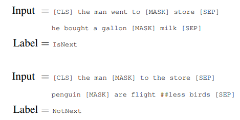 다음으로는 Next Sentence Prediction에 대해 알아보겠습니다. 여러 자연어 문제 중 일반적인 언어 모델으로는 학습할 수 없는 문장 간의 관계를 이해해야 하는 Question Answering(QA)와 Natural Language Inference(NLI)가 있습니다. 이러한 문장의 관계성을 학습하기 위해 이진화 분류 문제인 Next Sentence Prediction 태스크를 추가적으로 도입하였습니다. 문장 A와 B를 pre-training 데이터에서 선택하고, 50%는 실제로 이어져있는 문장 (IsNext)로 구성하고, 나머지 50%는 전혀 관계없는 문장(NotNext)으로 구성합니다. 그저 두 문장이 이어져 있는가 이어져 있지 않은가를 맞추기만 하면 되는 아주 간단한 문제입니다. 그러나 이러한 간단함에도 불구하고, QA와 NLI 문제에 대해 아주 효과적이라고 합니다. NSP는 (Discourse-based objectives for fast unsupervised sentence representation learning) 논문에서 아이디어를 따왔다고 합니다. 그러나 이를 도입한 첫 논문에서는 해당 방식으로 Sentence embedding을 하여 문제에 적용되었지만(Feature-based), BERT는 모든 파라미터에 대해 전이 학습한다고 합니다. 이 역시 밑의 예시를 보면 이해가 더 잘 될 것 같습니다.