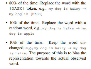 "이렇게 전체 데이터 셋에서 틀린 단어를 집어넣으면 언어 모델이 잘 학습이 안될 수 있지 않을까?"라고 의문을 가지는 똑똑한 학생이 또 있을 수 있습니다.(짝짝짝) 이에 대해 논문에서 설명하기론 전체 데이터에서 15%만큼의 토큰을 MASK토큰으로 선정하고, 그중 10%를 랜덤한 토큰으로 바꿉니다. 즉, 이는 전체 데이터셋의 1.5%밖에 해당되지 않아 모델이 전체적인 언어에 대한 이해를 하는데 큰 영향이 없을 것이라고 합니다. 또한 이러한 방식을 채택하게 되면 Transformer encoder가 최종적으로 어떠한 단어를 예측해야 될지 모르기 때문에 이를 맞추기 위해 모델은 강제적으로 모든 입력 시퀀스에 대해 문맥 정보를 유지해야 합니다.(어떤 단어를 문제로 낼 지 모르니 모든 문장에 대한 흐름을 파악하고 있어야 합니다..!)