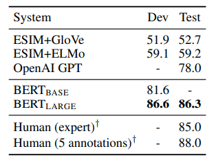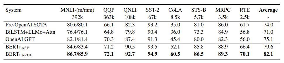 11개의 서로 다른 NLP 문제에 BERT를 적용하여 실험을 해봤다고 합니다. 결과적으로 모두 SOTA를 달성하였습니다. 여러 실험에 대한 세팅은 직접 논문을 읽어보시길 바라며 짧게 사용한 벤치마크와 결과를 올려드리겠습니다.