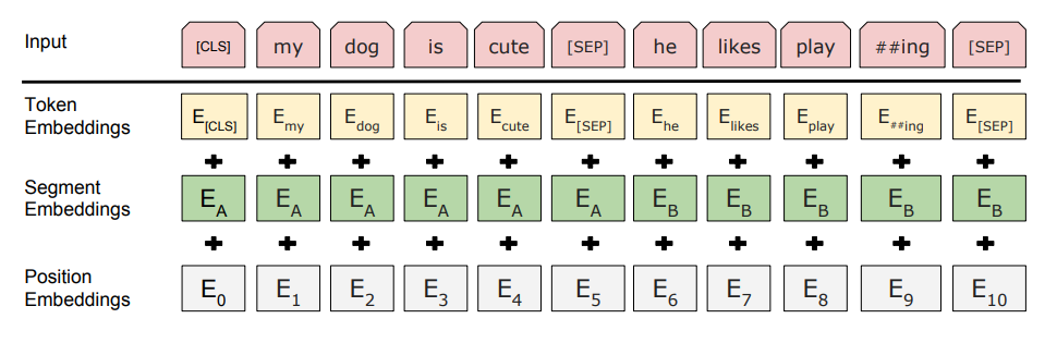 BERT는 2가지 방법으로 문장을 구별합니다. 첫 번째는 [SEP]이라는 특수한 토큰을 이용하여 문장을 둘로 나눠 구분합니다. 두 번째는 모든 토큰에 학습된 임베딩을 추가하여 입력 시퀀스를 구성하고 있는 토큰 중 어떤 토큰이 문장 A, B에 속해있는지 표시하는 방법입니다. (일반적으로 Segment Embedding을 적용할 때 그냥 Sentence A에 속하는 토큰에다가 0, Sentence B에 속하는 토큰에다가 1을 더해줍니다.) 주어진 토큰에 대해 Positional, Segment, Token embedding의 값을 모두 합한 값이 그 단어의 최종 Input Embedding이 됩니다.