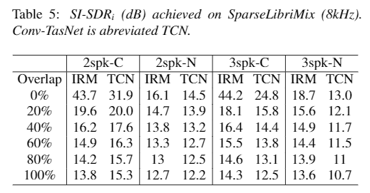 이 논문에서는 위에 표에서 볼 수 있듯이 SparseLibri2Mix와 SparseLibri3Mix의 8KHz 테스트셋에 대한 결과를 보고합니다. 여기도 역시 노이즈가 없는 데이터셋과 노이즈가 있는 데이터셋이 있습니다. 이 데이터셋을 평가하기 위해 위에서 사용한 8KHz non-sparse 데이터셋에 대해 학습한 모델을 사용합니다. 이 테이블의 결과에 대해서 두 명 그리고 세 명의 mixture 모델을 보면, overlap이 높으면 SI-SDR이 낮은 것을 확인할 수 있습니다. 100% overlap된 경우 당연하지만 Table 4 와 유사한 결과를 얻을 수 있습니다. 왜냐하면 Table 4 는 100% overlap된 데이터셋이기 때문입니다. 흥미롭게 볼 점은 overlap이 작을 때 Conv-TasNet의 성능은 IRM과 비교했을 때 작습니다. 이는 sparsely overlapping mixtures 데이터셋에 대한 speech separation 모델의 개선 여지가 있음을 의미합니다.