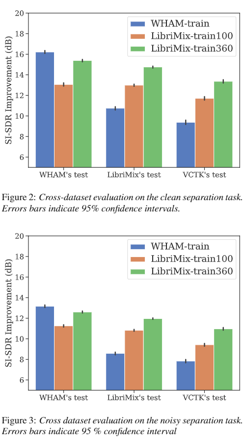 최근 연구에서는 speech separation 모델이 wsj0-2mix 데이터셋에 대해서 학습됐을 때 다른 데이터셋에 대해서는 적절히 generalize를 하지 못한다는 것을 확인했습니다. 이런 연구와 비슷하게 이 논문에서도 다른 데이터셋으로 Conv-TasNet을 학습했을 때 모델의 generalization 능력을 확인하는 연구를 진행했습니다. 이 논문에서는 여섯 개의 다른 Conv-TasNet 모델들을 WHAM! train, LibriMix train-100, train-360 데이터셋의 노이즈가 없는 버전과 있는 버전 둘 다에 대해서 학습을 진행합니다. 이 모델의 결과에 대한 것은 위 그림에서 볼 수 있습니다. 위 그림에서 Fig. 2 는 노이즈가 없는 것에 대한 결과이고 Fig. 3 은 노이즈가 있는 데이터에 대한 결과입니다. 일단 여기서 알고 계셔야 할 것은 모든 테스트셋에 대한 노이즈 샘플이 일치한다는 점입니다(노이즈에 대한 데이터셋은 WHAM! 에서 가져오기 때문에 어쩔 수 없어요). 그럼 결과를 봐 봅시다. 노이즈가 없는 데이터와 노이즈가 있는 데이터 둘 다에 대해서 WHAM! 으로 학습된 모델은 separation task에서 좋지못한 generalize 성능을 보여줍니다. LibriMix 데이터셋에 대해서 LibriMix로 학습된 모델과 비교했을 때, 약 4db 정도 떨어진 성능을 보여주는 것을 위 그림에서 확인할 수 있습니다. 반면에 LibriMix로 학습된 모델은 WHAM! 테스트셋에서 비교했을 때 아주 약간의 차이밖에 발생하지 않았습니다. VCTK-2mix 테스트셋에 대해서도 WHAM! 데이터셋으로 학습된 모델은 성능이 좋지 않지만 LibriMix 데이터셋으로 학습된 모델은 성능이 다른 테스트셋과 비교했을 때 비슷한 것을 확인할 수 있습니다. 이 결과에서 보면 LibriMix의 train-100과 train-360 데이터셋에 대한 모델의 성능차이가 심한 것을 확인할 수 있는데, 이를 통해 generalize의 핵심 키는 데이터의 양이라는 것을 확인할 수 있습니다. 결과를 보면 WHAM! 데이터셋의 양이 매우 불충분한 것을 확인할 수 있습니다. 이 결과를 통해 노이즈가 없는 버전과 있는 버전 모두에 대해서 LibriMix 데이터셋이 wsj0-mix 데이터셋보다 더 좋은 generalization 성능을 보여주는 것을 확인할 수 있습니다.
