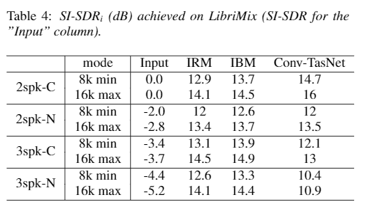 이제 결과를 알아봅시다. 일단 이 논문에서는 LibriMix 데이터셋을 사용해 얻을 수 있는 결과를 평가하기 위해 Conv-TasNet 을 사용합니다. 그리고 평가는 SI-SDR을 사용합니다. SI-SDR의 경우 무음 데이터에 대해서는 정의되지 않으므로 모든 max 버전에서 보고된 결과는 일치하는 min 버전에서 학습된 모델에 해당합니다.