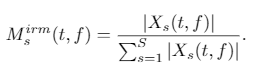 첫 번째로 Ideal Ratio Mask (IRM) 입니다. 각각의 source signal에 대한 IRM은 다음과 같이 정의되어 있습니다.