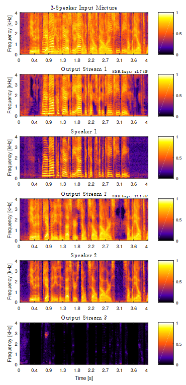 마지막으로 uPIT에서는 slient channel이라는 세 번째 출력 뉴런을 만들어 세 명의 speaker에 대한 부분도 처리할 수 있게끔 만들었습니다. 특히 이 모델의 세 번째 출력 뉴런을 위해 두 혼합 음성보다 70db 낮은 white Gaussian noise를 사용하여 wsj0-2mix 데이터 셋을 학습하였습니다. 이렇게 wsj0-2mix와 wsj0-3mix 데이터 셋을 함께 학습하고 테스트한 결과 입력되는 음성에 화자가 몇 명이 있는지 모델에 가르쳐주지 않아도 모델이 적절히 분리해내는 것을 확인할 수 있었습니다(아래의 그림을 보시면 두 명의 speaker가 입력으로 들어올 경우에 slient channel에 정말 낮은 db이 출력된다는 것을 확인할 수 있어요). 이는 굉장히 중요한 발견으로 speaker separation을 하는데 화자의 개수라는 추가정보가 필요하지 않을 수도 있다는 발견을 한 것입니다.