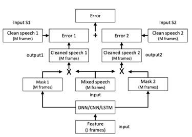 예전의(사실 불과 몇 년 전이지만) 딥러닝 베이스 speech separation에서는 아래 그림과 같이 multi class regression 문제를 해결하는 방식으로 문제를 해결했습니다. 그렇게 추론된 mask를 mixed segment에 element wise 곱을 통해 계산해서 source를 각각 분리하는 방법으로 진행됐습니다.